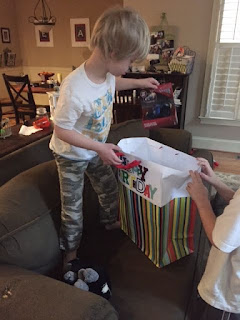Unlike his brothers, this one could care less about gifts, and often times can't be bothered by them. So we have to be strategic and give them to him over time. This was his first one.